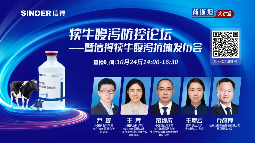 10月24日(周二)下午14:00-16:30,山東信得科技股份有限公司特邀中國農(nóng)業(yè)科學(xué)院哈爾濱獸醫(yī)研究所常繼濤副研究員、王芳副研究員和南京農(nóng)業(yè)大學(xué)王德云教授,共同出席山東信得犢牛腹瀉防控論壇暨犢牛腹瀉抗體發(fā)布會。