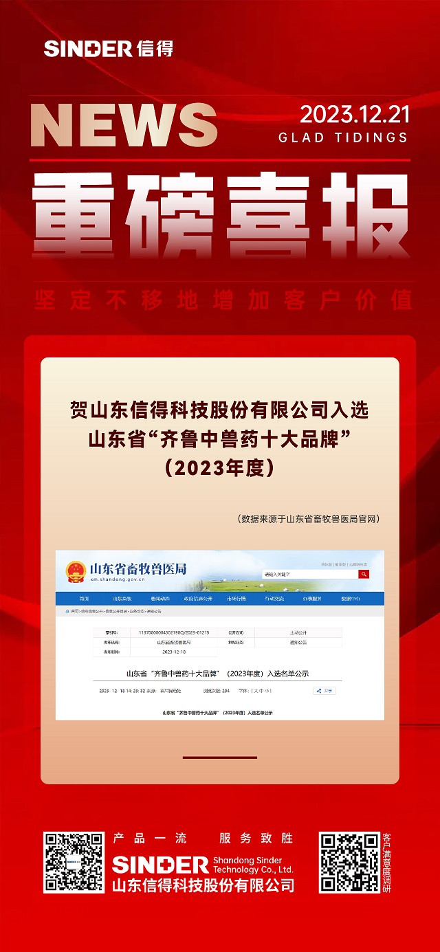 2023年12月20日,山東省畜牧獸醫(yī)局公布了“山東省 ‘齊魯中獸藥十大品牌’(2023 年度)”名單,山東信得科技股份有限公司憑借其卓越的中獸藥研發(fā)、生產(chǎn)和銷售能力,榮獲“山東省 ‘齊魯中獸藥十大品牌’(2023 年度)”的殊榮。