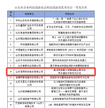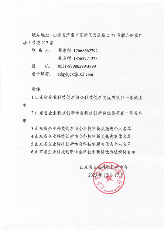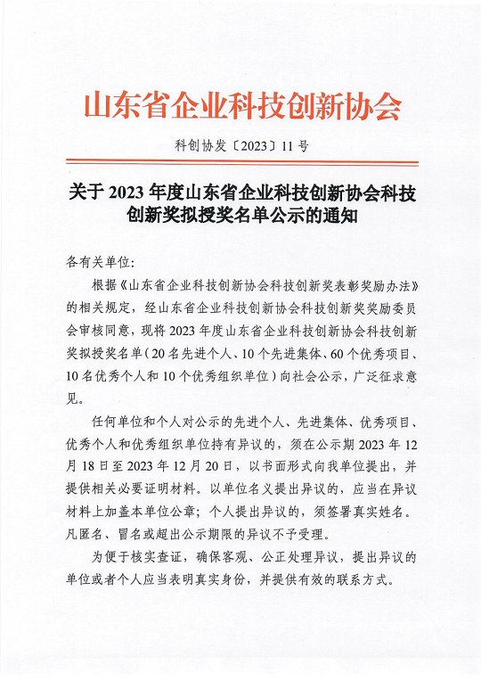 近日,山東省企業(yè)科技創(chuàng)新協(xié)會(huì)公布了2023年度山東省企業(yè)科技創(chuàng)新協(xié)會(huì)科技創(chuàng)新獎(jiǎng)優(yōu)秀項(xiàng)目一等獎(jiǎng)名單。據(jù)《山東省企業(yè)科技創(chuàng)新協(xié)會(huì)科技創(chuàng)新獎(jiǎng)表彰獎(jiǎng)勵(lì)辦法實(shí)施細(xì)則》,科技創(chuàng)新獎(jiǎng)擬授獎(jiǎng)名單經(jīng)山東省企業(yè)科技創(chuàng)新協(xié)會(huì)評(píng)審委員會(huì)評(píng)審、山東省企業(yè)科技創(chuàng)新協(xié)會(huì)審核。