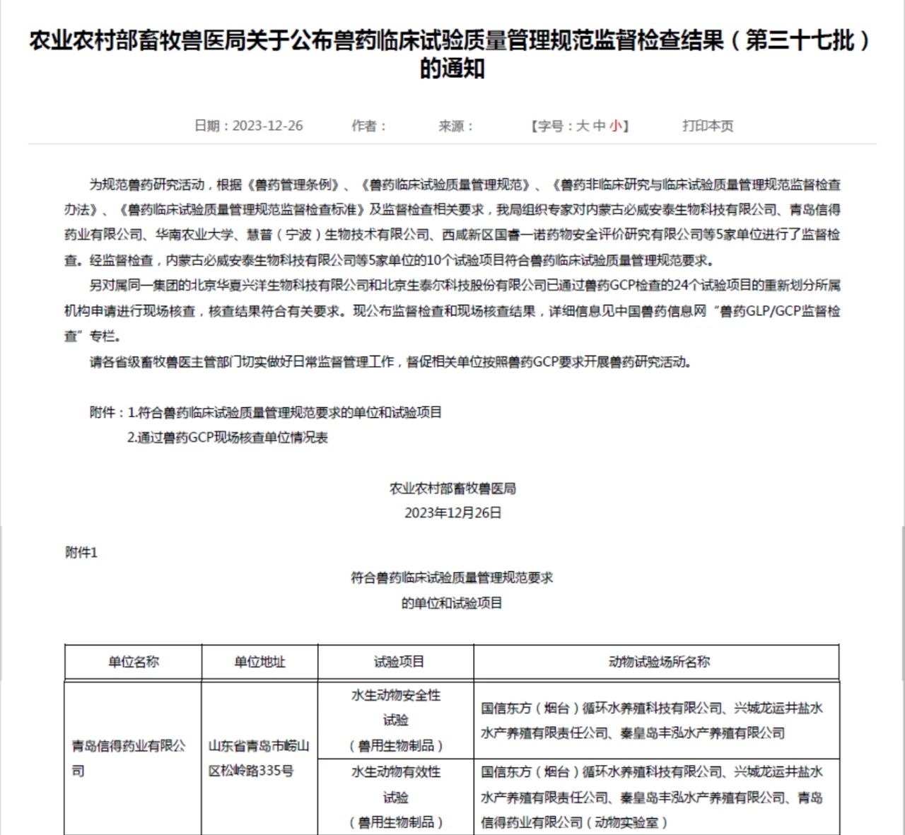 2023年11月16日至17日,農(nóng)業(yè)農(nóng)村部畜牧獸醫(yī)局組織監(jiān)督檢查專家組對(duì)青島信得藥業(yè)有限公司實(shí)施獸藥臨床試驗(yàn)質(zhì)量管理規(guī)范(獸藥GCP)現(xiàn)場(chǎng)監(jiān)督檢查。此次檢查項(xiàng)目為水生動(dòng)物安全性試驗(yàn)(獸用生物制品)和有效性試驗(yàn)(獸用生物制品)。